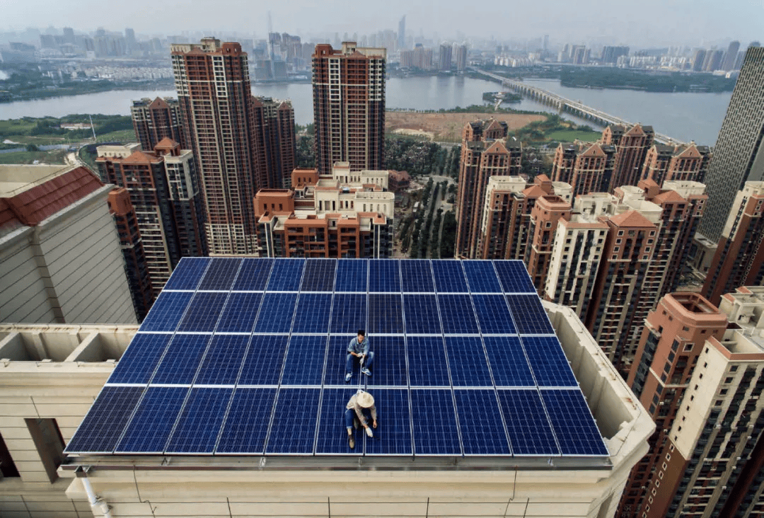2017年5月15日,湖北武汉,工人在一座47层高的大楼顶上的太阳能电池板上作业。