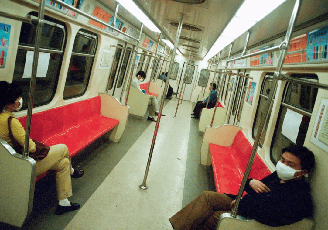 2003年5月2日,由于非典疫情的肆虐,昔日人满为患的北京地铁里,只有寥寥几个戴着口罩的乘客。