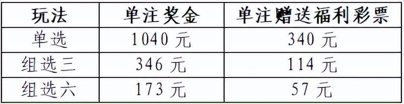 单张彩票投注金额满20元(含)以上的,在中得单选、组三、组六原奖级的同时,每注可分别获得340元、114元、57元的福利彩票,倍中倍赠。赠送福利彩票规则如下: