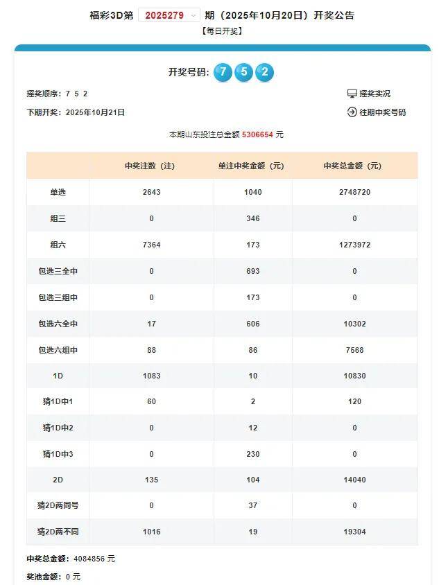 在2025年10月20日的3D第2025279期开奖中,全国共中出2643注单选奖,单注奖金1040元;组六奖7364注,单注奖金173元。